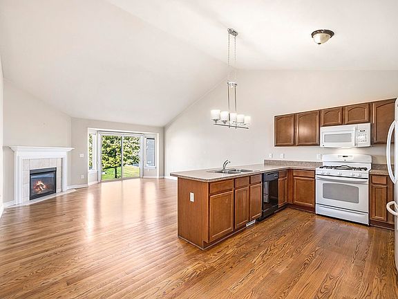 Nestled in a quiet, well-kept community, this airy 2-bedroom, 2-bath condo welcomes you with a bright, open layout, vaulted ceilings, and beautiful finishes throughout. Hardwood floors flow seamlessly through the foyer, kitchen, and great room, adding warmth and continuity to the main living areas. The spacious great room features large windows and a cozy gas fireplace, perfect for relaxing or entertaining. The open-concept design connects the living area to a well-equipped kitchen with all appliances included, making meal prep and hosting a breeze. The primary suite offers vaulted ceilings, a large walk-in closet, and a private en-suite bath. The second bedroom is ideal for guests, a home office, or flex space, with a second full bath just steps away. The full unfinished basement exhibits endless potential, featuring an egress window, backup sump pump, and a prepped half bath—ready for your custom finishing touches. The attached garage includes a gently sloped ramp, providing easy, wheelchair-accessibility and enhancing overall mobility and convenience. The seller is including a one-year home warranty, providing added peace of mind. Make your move and experience comfortable living—book your visit today!