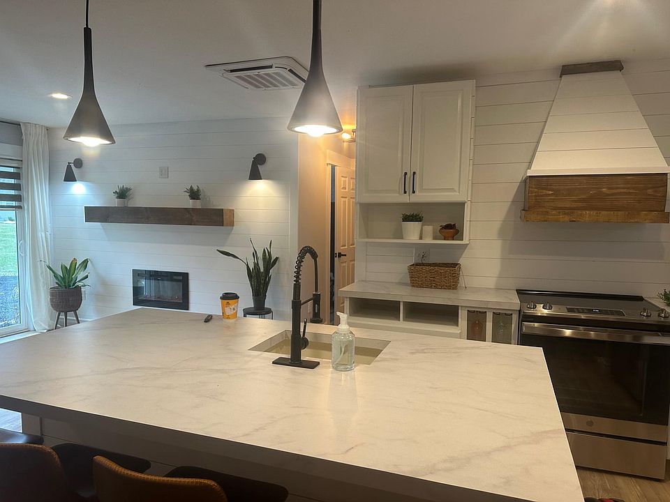Cement patioBuilt in storageBarn doorsOpen concept kitchen livingroomCustom modern farmhouse kitchen