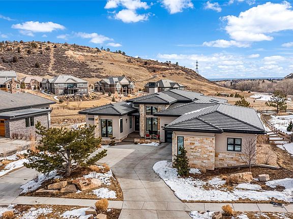 This is true Colorado living in an upscale classically modern home. Nestled in the tranquil foothills of the Montane community, this one of a kind creation from Russo Residential Homes was newly built in 2020. This high end ranch style property has modern conveniences throughout showcased in stunning design elements with state of the art building and mechanical components. Attention to detail is apparent in every square inch from its wide plank white oak floors to its high ceilings. Enter, and you are instantly connected to nature through the thoughtfully positioned windows granting you views of the sunrise and rolling foothills. In the hub of the home, you will find a 5 burner Mercury Aga Range, Benedettini Cabinetry, stone countertops, a huge island and walk in pantry. The striking all glass office/library has built in storage and a paneled accent wall all on display to the great room with access to the upper deck via floor to ceiling windows by Western Sliding . Retreat to the primary suite with more amazing views as well as double vanities, soaking tub, huge walk in shower and a large walk in closet connected to the main floor laundry. The floating open staircase leads you to the walkout basement with 3 more bedrooms. 2 more bathrooms, a large entertainment area with a double sided fireplace and wet bar. In addition, a custom vault room with security doors can help you store your most valuable items. The covered patio has a weather protective screen to extend your year round usage. Situated on .50 acres you can find yourself enjoying nature, wildlife and views while relaxing in the hot tub or sitting around the gas fire pit with family and friends. This home also has a rare 5 car heated garage, so storing or working on your toys is a breeze. Close to hiking trails, Red Rocks Amphitheater, Red Rocks Country Club, Main Street Morrison, C470, downtown Denver and the Rocky Mountains, this location grants you easy access to why you have chosen to live in Colorado.