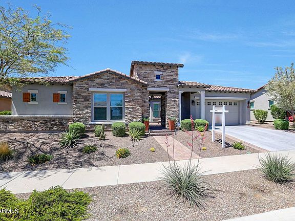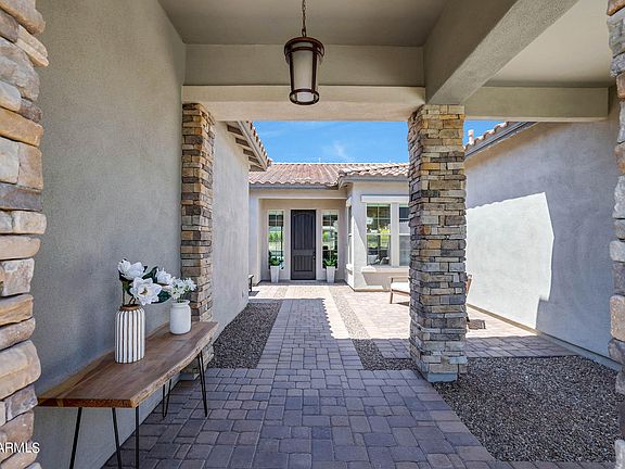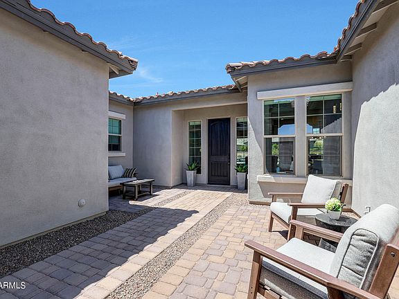 Introducing David Weekley's highly coveted model, the Serendipity. This home embodies the epitome of sophistication, beginning with its enchanting courtyard that sets the tone for the grandeur within. Throughout this stunning residence, you'll find beautiful upgrades, an expansive great room, a chef's entertaining kitchen, and a spacious dining area complemented by a large butler's pantry. Solar shades grace the interior windows, while the primary bedroom boasts a luxurious en suite bath and a generously sized walk-in closet. Two secondary bedrooms each feature their own en suite bath for added convenience. Step outside through the 16' sliding glass doors leading to an extended travertine patio, where you can bask in breathtaking mountain views while enjoying the resort-s tyle pool. The patio is equipped with Havana-powered sun shades and a gas line, offering the perfect canvas for creating your dream outdoor kitchen. Completing the picture are epoxy floors in the garage and custom cabinets, adding both style and functionality to this exceptional home. Experience the Victory Lifestyle!
