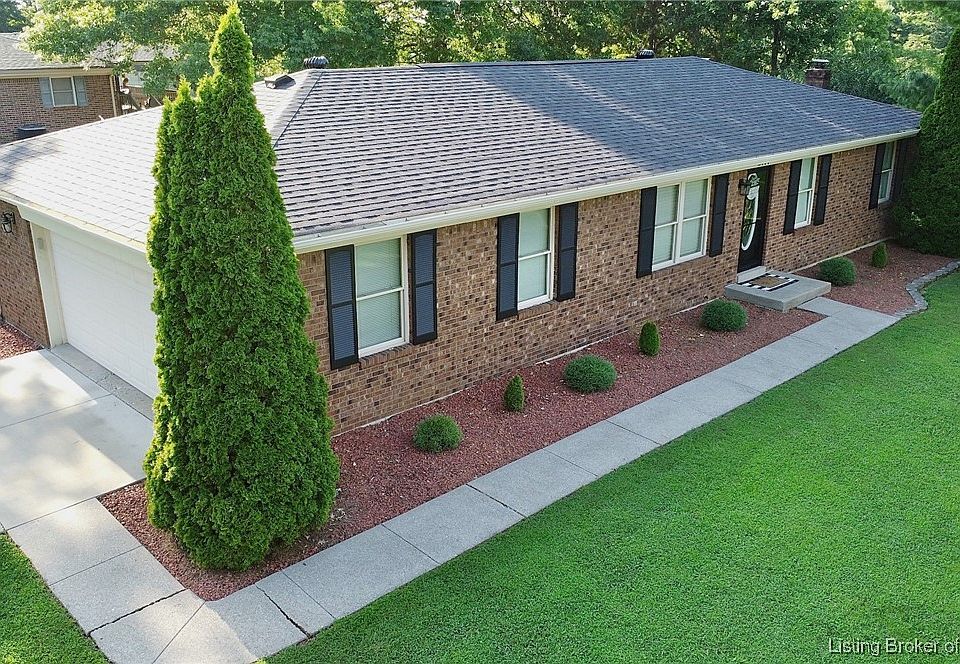 ALL BRICK, MOVE-IN READY, FLOYD CENTRAL SCHOOL DISTRICT 3BR/2BA Highlander Village home w/partially finished basement, large corner lot/big fenced yard and a two car side entry garage. ELIGIBLE FOR USDA 100% FINANCING. Many updates included NEW DIMENSIONAL SHINGLE ROOF just installed, HVAC serviced/cleaned 2025, NEW driveway 2021, kitchen updates done 2020 included NEW stainless steel appliances (GAS oven/range), NEW carpet in basement 2023 and new pool liner in 2022. OTHER NOTABLE FEATURES...covered back patio, swimming pool w/deck/electric outlet, LP gas connection for grill on patio, BIGGER two car garage compared to what you see in new construction, nicely landscaped yard w/mature trees, home theater projector in basement family room, LOTS OF STORAGE in unfinished areas of basement. ONLY 11 MINUTES TO SHERMAN MINTON BRIDGE. All measurements are approximate buyer/buyer agent to verify prior to offer if critical. Showings begin Saturday 8/2/25. Need at least 24 hours for response to offers until 8/4/25.