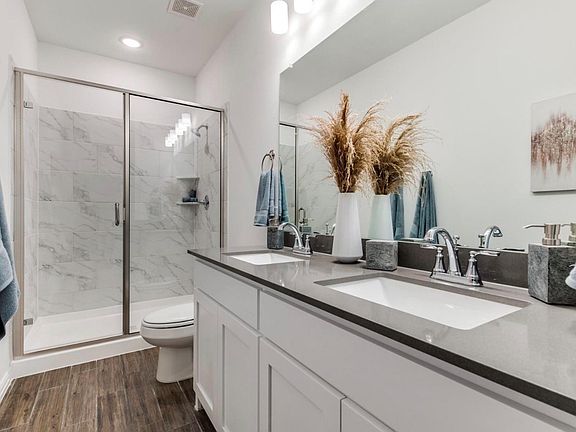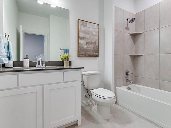 Modern tile colorsLuxurious walk-in showerWhite cabinetsFamily room upstairs