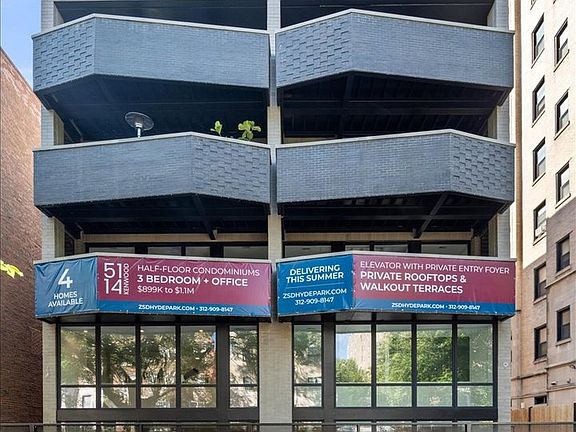 DELIVERING NOW! Introducing 5114 Kenwood - a collection of new construction luxury condominium residences now completed in Hyde Park. Tucked along a quiet, tree-lined, one-way street, 5114 Kenwood delivers the product missing in the neighborhood: single-level contemporary living and light-filled duplex residences - boasting incredible private outdoor living spaces - in an elevator-accessible building with secure parking. Acclaimed developer ZSD, having achieved success with mid-rise developments in West Loop, Lincoln Park, and Noble Square, brings their skillful experience and thoughtful design to Hyde Park. Penthouse A is a stunning half-floor, single-level condo in the building and stretches the length of the top level, with south, west, and east exposures. The elevator delivers residents and guests to a posh foyer and sleek entry. A clean, contemporary aesthetic is carried throughout the home beginning with a massive 19-ft kitchen with flat front cabinetry, large island, pantry closet, and integrated appliances: Bosch dishwasher, Fisher & Paykel refrigerator/freezer, Kitchen-Aid induction range, and externally-vented exhaust hood. The 22-ft wide living room and dining spaces open to a 200 SF east-facing walkout balcony with gas, water, and electric hookups included. Wide-plank wood flooring runs throughout the home. The secluded Primary Suite features a 15-ft wide bedroom, massive dressing room, and contemporary bathroom with floating double vanity, European glass shower, and private water closet. Two secondary bedrooms are designed to easily accommodate a queen bed with nightstands and share an ensuite bathroom featuring porcelain tile, bathtub, wall-hung vanity, and quartz countertop. A powder room is located off the main hallway for non-overnight guests. The private office with natural north light creates a desirable workspace, play area, or game room. Take the elevator to the rooftop to enjoy a private 414 SF rooftop deck - entirely private for this residence. One secure parking space included in purchase price. This is the first opportunity for new construction condominium residences in prime Hyde Park in decades. From 899K to 1.1M. Move-in now. Don't miss your chance to call 5114 Kenwood your next home.