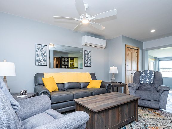 Completely renovated for year round living or a no maintenance Lake Life. This adorable property sits on 75 feet of prime lakefront with a boat dock on 65-acre, no-wake Pine Lake—the lake is owned by the residents. Listed as a one-bedroom, this home sleeps 6 with a comfortable, new pull-out couch, and add a hideaway bed in the family room. The kitchen features quartz counters, a dual cast iron sink, stainless steel appliances, and lake views. The living room has ceramic floors and a new high efficiency mini-split heat pump and A/C for year-round comfort. The full bath boasts marble floors and a custom tiled shower. The open family room and dining area is perfect for relaxing. Amazing views out the 8 new Pella windows, quartz sills, a ceiling fan, and a pellet stove to stay cozy on cool nights. Knotty alder doors add a rustic touch to this inviting space. This lakefront gem offers both tranquility and comfort, making it the perfect retreat.