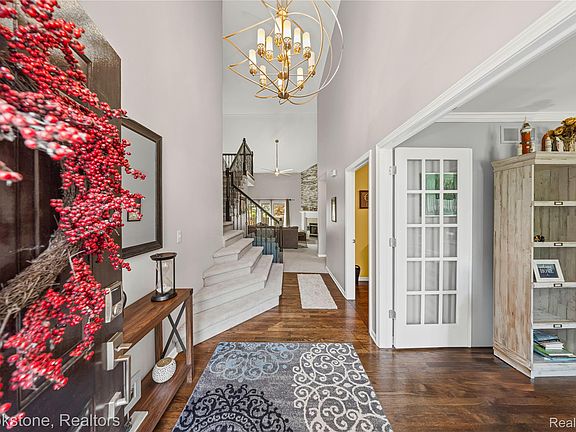 Welcome to this stunning, fully updated 3-bedroom, 4-bath split-level home nestled in the charming community of Chesterfield Twp. This home offers 2,220 sq ft of above-grade living space plus a fully finished basement perfect for entertaining with a newly added egress window enhancing safety and potential for 4th bedroom. Recent upgrades include porcelain tile flooring in kitchen, dining and laundry room, beautiful chandelier, modern light fixtures, ceiling fans and new hardware throughout. The foyer presents an elegant split staircase leading to upper level. The kitchen is equipped with granite countertops, stylish backsplash, stainless steel appliances, including a double oven. New refrigerator and toucheless faucet (2024). A standout feature is the living room's updated fireplace wall, beautifully finished in brick all the way to ceiling. Also showcasing high vaulted ceilings and hardwood flooring. First floor primary suite features vaulted ceilings, a spacious walk-in closet with new barn doors, an updated en-suite bathroom with a sleek concrete countertop on vanity and large tub. Newly installed toilets with bidets. Basement boasts ample storage space, wet bar, newer infrared sauna, recessed lighting, projector for movie nights and a built-in entertainment wall. Large, fully fenced backyard with a vegetable garden and mature arborvitae offering both privacy and tranquility for a backyard retreat. Freshly painted deck with pergola extends the outdoor living space. Conveniently located near restaurants, shopping, golf courses and minutes from Walter and Mary Burke Park Beach, downtown New Baltimore with free beach access. Anchor Bay Schools. Roof and hot water tank (2017) Insulated triple pane windows and door walls (2016) Ring cameras stay with the home. Don't miss your chance to see this turnkey property!