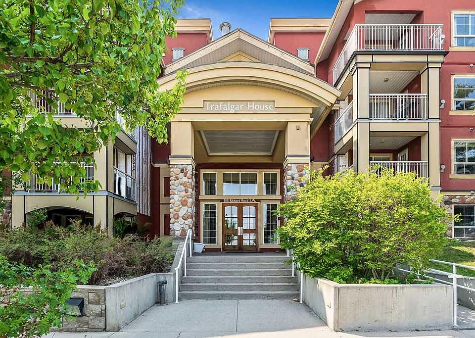 2-Bedroom Condo right next to Calgary's Mount Royal University – Investor or First-Time Buyer Alert! Bright corner unit with 2 bedrooms, 2 bathrooms, and 2 balconies in sought-after Trafalgar House. Steps from Mount Royal University, this condo features a modern kitchen with granite counter tops and stainless steel appliances, open floor plan with a spacious den, cozy gas fireplace, and in-suite laundry. The primary bedroom has double closets, ensuite, and private balcony. A second bedroom and full bath make it perfect for roommates, guests, or family. Enjoy underground titled parking, storage locker, fitness centre, and courtyard. With shopping, cafes, transit, and green space at your door, this move-in ready home offers incredible value and strong rental potential. Ideal for investors or first-time buyers—don’t miss out!