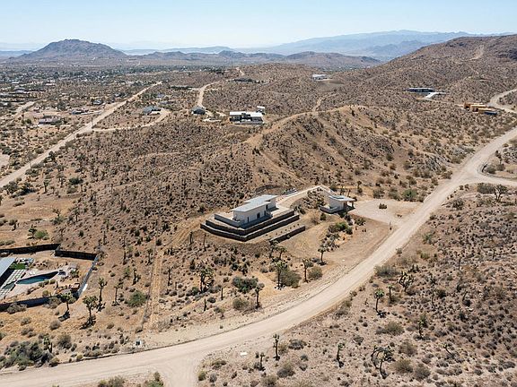 Brand New Construction! Your new sanctuary is available now in this new designer construction nestled on 2.29 hillside acres with sweeping views over Yucca Valley. Luxuries include soaring ceilings, energy star windows, custom-cut concrete flooring, and energy efficient AC mini splits. Enjoy inspiring vistas of rolling hills, distant mountains, and mature beautiful Joshua Trees. This 1,200 sq ft retreat offers 2 beds, 2 baths, a detached carport, and modern elegance.The living room features an electric fireplace and glass sliders, seamlessly connecting indoor and outdoor spaces. Entertain in the dining area with a quartz table and pendant chandeliers. The gourmet kitchen boasts stainless steel appliances, ample cabinetry, and a propane stove. Spa-like bathrooms include a double vanity, walk-in glass shower, and tile accents. The master bath offers a floating vanity and glass walk-in shower, with the master bedroom featuring built-in closet space and patio access. Outside, a concrete patio and stone pebbles offer a harmonious hillside ambiance. Gabon stone retaining walls and terrace steps enhance the landscape. Additional features: laundry area, paid solar system, and ample grounds for horses. Located 12 miles from Joshua Tree National Park and near Pappy and Harriets, this retreat offers access to restaurants, cafes, bars, and amenities. Just 33 miles from Palm Springs, discover your oasis.