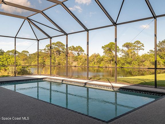 Discover refined lakefront living on 1.28 acres in The Trails, one of North Merritt Island's most sought-after communities. This 5-bedroom, 3.5-bath residence was fully remodeled in 2017 and offers luxury finishes, modern systems, and exceptional craftsmanship throughout. The interior showcases porcelain tile flooring in main areas, hardwood upstairs, and a chef's kitchen with StarMark soft-close cabinetry, glass-front uppers, under-cabinet lighting, and a full suite of Thermador appliances including double wall ovens, six-burner gas range, and dishwasher, plus a stainless French-door refrigerator and Sharp microwave drawer. Spa-inspired bathrooms feature frameless zero-threshold showers and granite or quartz counters. Additional highlights include a custom office with built-ins, an enclosed Florida room with mini-split A/C, Ecobee Smart Thermostat, tankless propane water heater, and newer Trane HVAC. The property features a 2-car attached garage and a 2022 constructed 2-bay RV garage with steel roof joists, epoxy flooring, tall ceilings, front and rear doors for drive-through access, and dual 30-amp hookups. Outdoors, enjoy expansive green space overlooking the lake, ideal for entertaining or quiet reflection, plus a solar-heated salt-chlorinated pool, extended screened deck, and Wi-Fi irrigation system. A Generac whole-home generator with 250-gallon propane tank provides peace of mind. Ideally located near NASA, SpaceX, and Blue Origin, Port Canaveral. This home is truly move-in ready - reference feature sheet for the full list of upgrades.