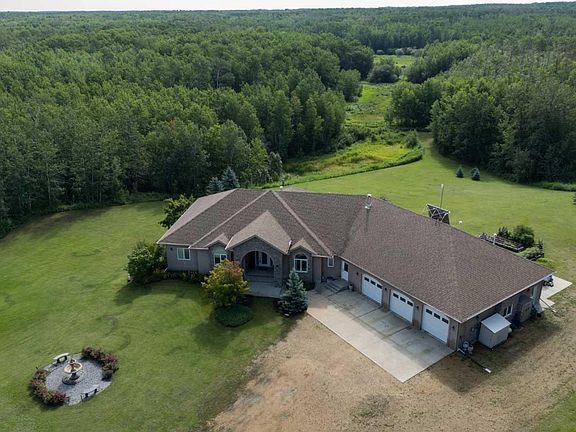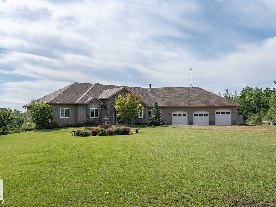 An Absolute Stunner! Have a look at this 78 Acre Estate just off Hwy 14 with no gravel & Not in Subdivision! Privacy, Serenity - this parklike setting gives you the comfort of country living with unspoiled natural surroundings. Quality Built & Expertly Finished - this home will impress inside & out. Expansive Main Floor living with open kitchen, living, dinette & dining room plus a heated 4 season sunroom & dedicated MF laundry. Large Primary with decadent 5pc ensuite, walk-in & secondary closets plus access to the deck. 40x40 heated triple garage with 1 bay as a drive through. Fully finished Walk out basement – large partially covered raised deck & full lower concrete patio. Hardwood/Tile Floors, Granite Counters, ICF Foundation, Stucco siding, Geothermal Heat, 2 fireplaces, full wet bar, 200-amp service & barely 15 mins to Sherwood Park.