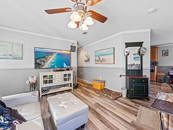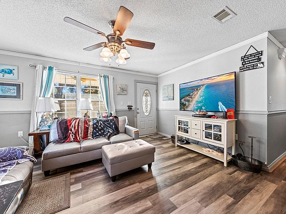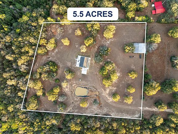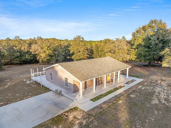 AT OWNER'S REQUESTS: DO NOT DRIVE ONTO THE PROPERTY WITHOUT AN APPOINTMENT. DOGS ARE RUNNING LOOSE. Country Life at its best. With almost 5.5 acres of land this cute 3-bedroom/2-bath is a great starter home or retirement retreat. It is very private and includes a covered front porch with views of 14 huge Oak trees & pond. Large Pole Barn for your RV or Boat. Inside you will find a living room, eat-in kitchen with granite counters, lots of cabinets, and stainless-steel appliances. Laundry room is off the kitchen which exits to a large wrap around deck. Newer laminate flooring throughout with tile in the bathrooms. The primary bedroom has its own private bathroom with a shower/whirlpool tub combo and linen closet. Other features include a totally fenced in property, deep well with new pump in 2022, water and electric hookups toward the front of the property. The whole yard has Bahia grass perfect for horses. New sidewalk and parking pad just added. Property line is at the tree line. Home is only 15 minutes to Crestview and easy access to Hwy 90. Home, Pole Barn, and Shed are sold As-Is.
