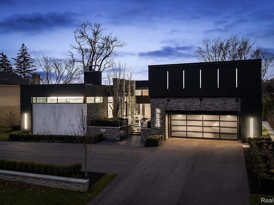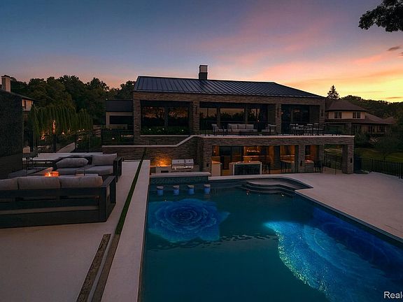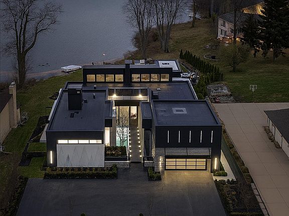 A stunning expression of modern lake-area living, this Tobocman-designed ranch estate offers over 6,700 total square feet and breathtaking panoramic views. Completely reimagined in a multi-year renovation finished in 2025, the home blends bold architectural design with refined contemporary comfort. Walls of glass create seamless indoor-outdoor flow, highlighting unforgettable sunsets and a private setting that feels resort-like year-round. Expertly redesigned with ADA-compliant accessibility, the interior features cohesive modern finishes, dramatic slab surfaces, expanded living spaces, and a beautifully crafted primary retreat. The newly added outdoor environment elevates the property even further with a mosaic-tiled gunite pool, water features, expansive porcelain terraces, an outdoor kitchen, fire elements, and full landscape transformation across the grounds. Set within a peaceful West Bloomfield enclave with nearby nature preserves and trails, this is a rare opportunity to own a true architectural statement—where luxury, design, and setting converge in one spectacular property.