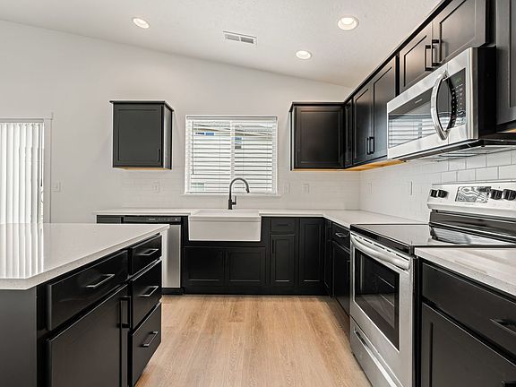Farmhouse sinkQuartz countertopsTons of natural lightStainless steel appliancesCorner lotSoft close cabinetsVaulted ceilings