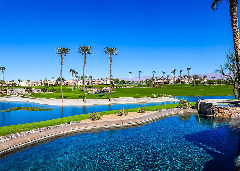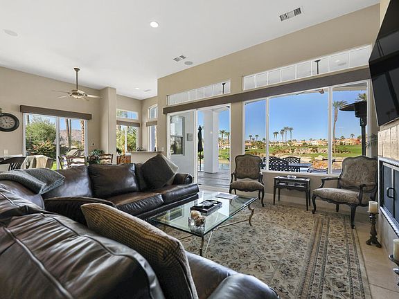 Premium private View lot!! Breath taking, Majestic mountain views, perched on top of a hill overlooking the 18th. hole, lake and serene waterfalls! This home is Immaculate in every sense of the word! Chiselled edge, Versaille pattern travertine flooring and high ceilings create the open airy feeling to bring the beauty of the view into this spectacular home. Living area with fireplace, Kitchen & dining area with wet bar are all open offering ease to entertain or just sit back and relax to take in the view. Vast side and rear yards are accessible by sliding glass doors from kitchen and den. Garage equipped with mini split AC unit. The resort like expansive patio with out door cooking area, pool & spa & fire pit are elevated overlooking lake, waterfalls to relax and enjoy the beauty of nature. Patio has misters for year round enjoyment. The guest suites are ensuites each with their own bathroom and located opposite side of the home for complete guest privacy. The Primary suite is located at the rear of the home for easy access to pool & spa and large windows to awake to the amazing views.