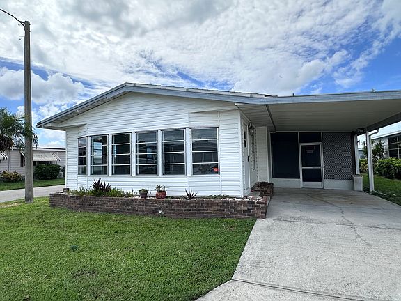 his home is bright and cheerful and on a corner lot near the pools and clubhouses. The roof was replaced in 2023 and new flooring is luxury vinyl plank flooring including new baseboards. The interior has all been replanted and the second bathroom has been updated. All the kitchen cabinets were refinished and epoxy countertops in the bathroom and kitchen. The new appliances in the kitchen are are stainless steel and has a breakfast bar island separating the kitchen from the living area. Cathedral ceilings gives it a very open and inviting feel and full of natural light. AC has been serviced with no issue. The huge front porch is enclosed and give you so much more living space. It has a newer washer/dryer in the humungous shed with double doors and plenty of storage space. The large screened in Lanai is a great open area and the screens are covered with lattice for your privacy. Come and see this great home at a great prices!!!