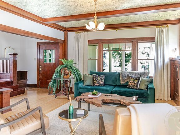 This downtown treasure blends the romance of history with modern convenience. Step into a light-filled living room with original hardwood floors, ornate wallpapered ceilings, and timeless light fixtures that capture the home’s character. The main level offers an updated kitchen, a grand dining room with built-ins, and a welcoming flow for gatherings. Upstairs you’ll find three spacious bedrooms, while the finished basement extends the living space with two additional bedrooms, a tiled bath, and storage. Outside, enjoy the charm of a shady front yard with mature trees, a sunroom porch for morning coffee, a single stall garage with a long driveway for plenty of off street parking and a large fenced backyard with sprinklers. This rare downtown gem combines history, craftsmanship, and comfort—ready to welcome its next chapter.