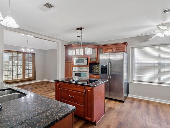 Large islandStylish flooringWalk-in pantryFenced backyardModern kitchenVaulted ceilingsSleek stainless-steel appliances