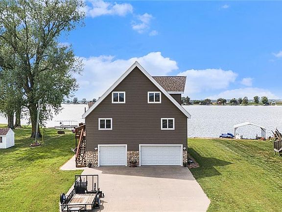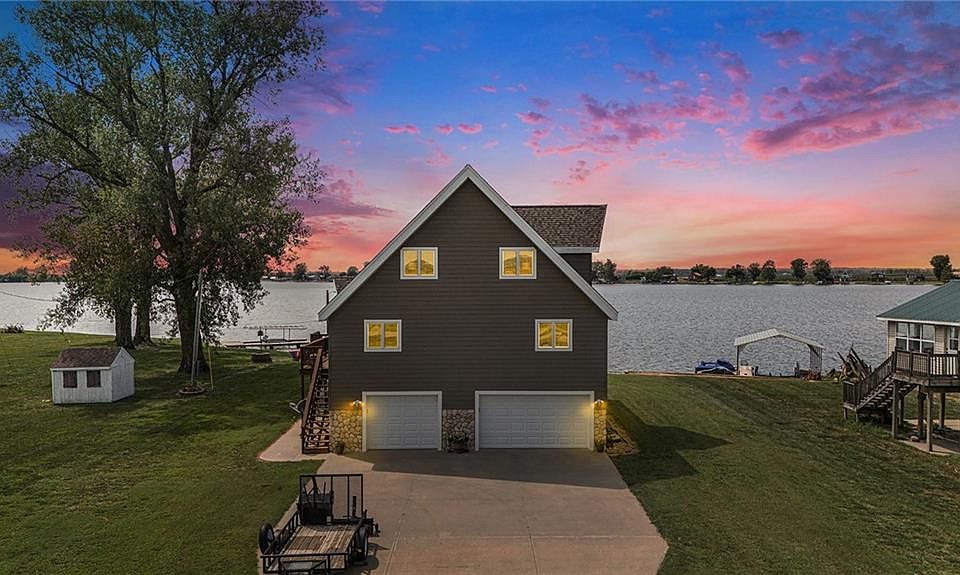 Experience lake-side living at its best — evenings on the lakeside deck, sunsets over the water, and a turnkey home ready for your family’s next chapter.This lakefront home offers 3 generous bedrooms and 3 full baths — updated with new toilets, plumbing fixtures, and luxurious quartz countertops in 2023. Inside, you’ll find meticulously maintained white-oak flooring, ceramic tile in kitchen and baths, and cozy carpet in the bedrooms. The open main-floor layout flows from the oversized kitchen (complete with peninsula seating) through dining into a living area with panoramic lake views. A spacious 750 sq ft deck off the main living level and a 180-sq ft dual-stair walkway invite outdoor enjoyment, while a 544-sq ft enclosed basement porch showcases two-story lake and sunset views. Major systems — HVAC, humidifier, water filtration & softener — were replaced in 2021; the roof and siding (impact-resistant roof, 2022 diamond-kote siding) ensure durable, low-maintenance exterior. The property includes two new boat docks (2023), a lift motor replaced 2024, and even a full bathroom-connected, 1,400-sf built-in garage with MyQ garage door opener + screened porch — perfect for boat, trailer, mower, and storage.