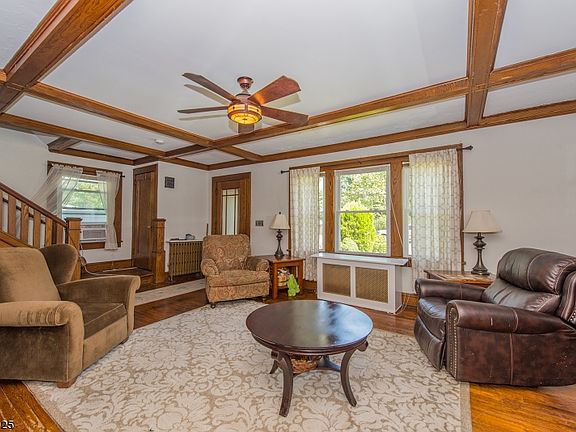 Beautifully updated home with character, curb appeal and many updates. 3 Bedrooms, 2.5 Bathrooms with so much EXTRA LIVING SPACE! First floor office, mud room, sunroom / nursery off of Master Bedroom, and HUGE Bonus Room on 3rd Floor with NEW Carpet and paint.  Living room has beautiful wood beamed ceilings, hardwood floors throughout and wood-burning fireplace with direct access to backyard. Backyard has spacious deck and yard with Detached Garage.  Lots of parking in lengthy driveway.  Spacious finished basement with great storage, handy-man work station, separate entrance, tiled floors and its own full bathroom too. Desirable location of Roselle just minutes away from downtown Cranford train station.