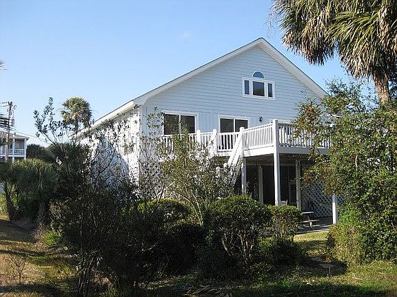 Stellar Buy on spacious 3rd row, 5 bedroom, 4 bath, 2200+ sq. foot home with ocean views and sea breezes! You will enjoy all the amenities of coastal living only 300' to the ocean. The main level was built for entertaining, featuring a great room with vaulted ceilings and exposed beams that opens onto the expansive sunroom with access onto the large rear sundeck! The open kitchen features two refrigerators, large breakfast bar and a breakfast nook with additional eating and storage. The great room offers two-story beamed ceilings, built-in cabinetry, hardwood floors and two sliding glass doors that open into the sunroom. The sunroom is saturated with natural light from the three sliders that open onto the outside sundeck and also features a dining area and additional sitting area. Enjoy la zy afternoons on the rear sundeck listening to the sounds of the surf and easily access the beautifully landscaped lawn from the two stairways off the deck. Three guest bedrooms, each with access to a private bathroom, and the master suite with access onto the sundeck are also located on the main level. The upper level features a large private guest bedroom that could also be used as an office or game room. Exterior features include a large paved driveway, enclosed outdoor shower, lots of covered parking, lattice enclosed storage and a storage room. Recent improvements include a new roof, new hardwood floors, new dishwasher, refrigerators, washer & dryer, new HVAC units, new exterior paint, new bath fixtures in 3 baths and was connect to town sewer in 2005! Sold fully furnished with few exceptions.