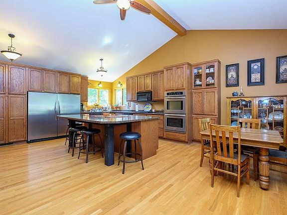 Wonderful in town acreage with a 2320 sq.ft. ranch home! Super quiet and private lot. Walk into a large vaulted and updated eat in kitchen with a huge island, dbl ovens, gas cooktop, full size refrig and freezer, dishw, hardwood floors and tons of cabinets. This leads you to the 1200 sq.ft. addition with a large family room with sliders to the deck, 2 beds w/lofts, large vaulted master with en suite bath and all the closet space you will ever need. Off the garage is a large mud room with laundry, closet and cabinets. A full bath finishes out the main level. In the lower level is a full bath, bedroom, family room with a full kitchen which could be a mother in law suite and tons of storage. There is also a large unfinished room with double doors where you can drive in your riding lawn mower. Rare find with this much sq.ft. in the home and land!