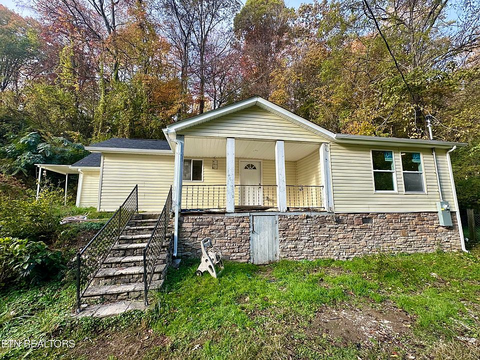 Charming ranch-style home nestled in a peaceful, green setting just 6 minutes from downtown Clinton. Surrounded by mature trees and open grassy areas, this property offers excellent outdoor potential perfect for creating a garden, adding a patio, or enjoying relaxing evenings in a private natural setting. The home features a welcoming covered front porch, attractive stone accents, and a spacious driveway with parking for up to three vehicles. Recent improvements include a new roof, as well as a washer and dryer for added convenience. Located in a quiet neighborhood with convenient