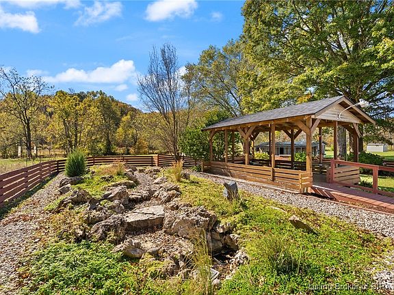 A rare opportunity awaits in the heart of Borden - 4.3 acres of potential surrounding this 4,413 sq. ft. estate with 5 bedrooms, 5 full baths, & over 7,000 total sq. ft. including a 2,900+ sq. ft. unfinished basement. Inside, enjoy two large living areas - one with hardwood floors, a fireplace, & a stunning bay window - plus a formal dining room & a main-level office with built-ins. The remodeled kitchen impresses with its dream passthrough window overlooking the peaceful backyard. Outdoors, discover a detached garage, gazebo, water feature, storage train car, & a creek meandering through the rear. The former pool now blooms as a garden sanctuary. Flooding in spring 2025 was professionally remediated, leaving a clean slate for renovation. Restore, reimagine, or expand - ideal for a multi-generational home, private retreat, or charming homestead.