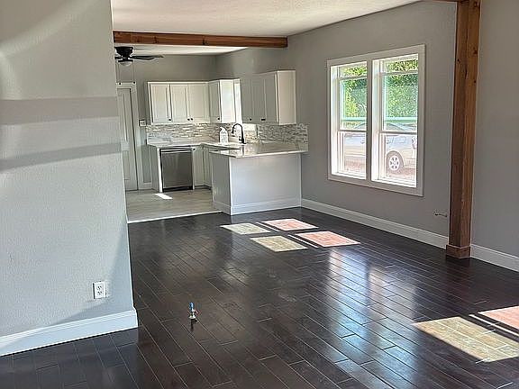 Fresh exterior appeal, striking dark siding, cedar post, stone work accent, welcoming front porch. Spacious open living area, beautiful dark wood floors.Exposed wood beams, and plenty of natural light. Modern kitchen, white shaker cabinets, granite countertops, custom backsplash, stainless steel appliances. Updated bathroom, elegant tile work built-in niche and contemporary fixtures, natural lighting. Large lot with plenty of yard space for outdoor activities or future projects, corner lot. Move-in ready all the work has been done for you. Must see.
