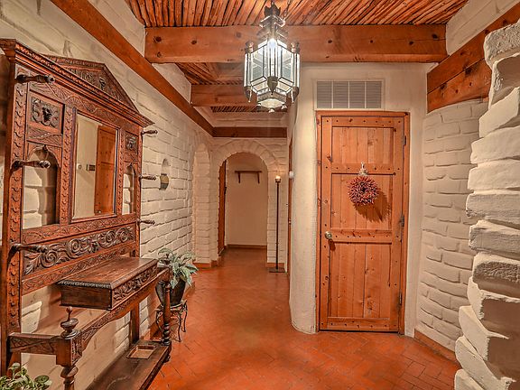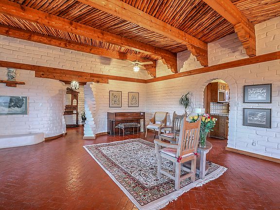 Distinctive custom adobe style casa with panoramic views of the Sandia Mountains, bosque and city. Passive solar adobe construction and herringbone brick flooring that run throughout this one-owner house are the hallmarks of the property's architecture. Raised beam ceilings with latillas, arched doorways, two large gas kiva fireplaces with banco seating, imported artisan tiles and fixtures add elements of the classic New Mexico style. Retreat into the large primary suite adorned with eclectic bathroom tiles and spa tub.The dining area can command an expansive dining table and is crowned by an imported elegant chandelier. Terraced gardens with bricked pathways invite you to enjoy tranquil outdoor living surrounded by privacy and enchanting views.