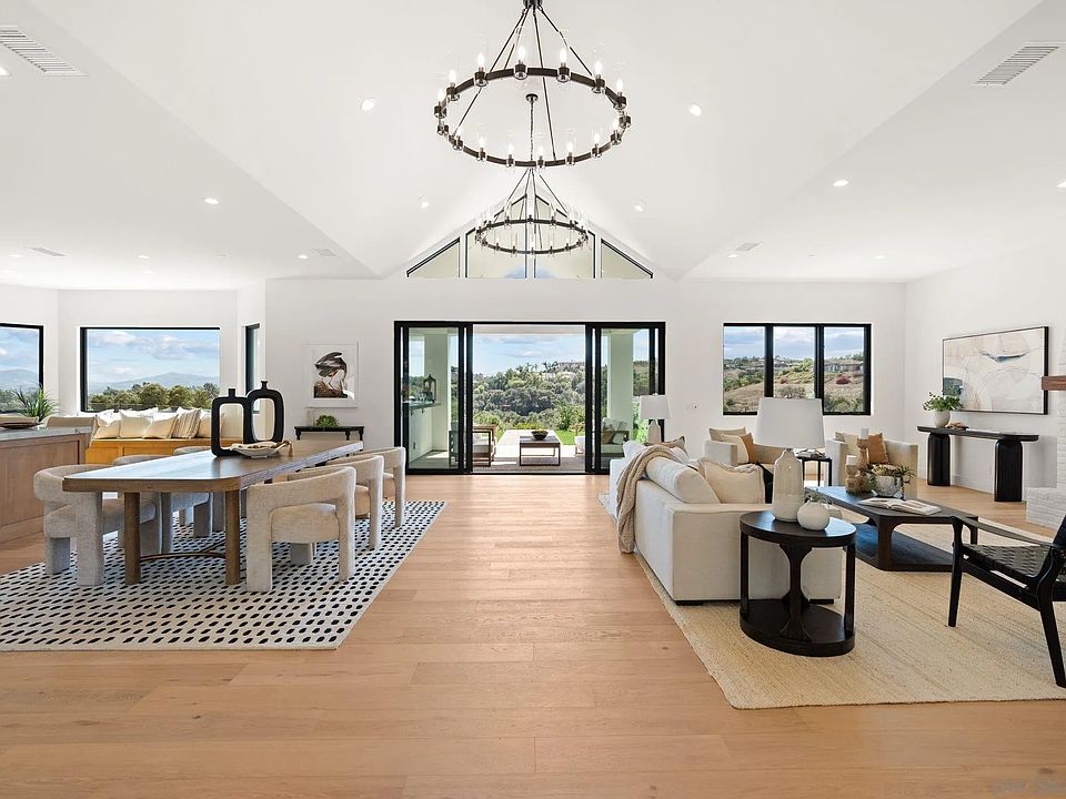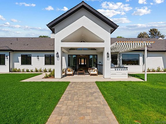 Set in Fallbrook’s exclusive Hill Ranch neighborhood, this brand-new modern farmhouse offers 4,488 SF of single-level living on 2.2 acres. Designed with both luxury and comfort in mind, the home features 4 bedrooms and 4 bathrooms, including a spacious primary suite with a spa-inspired bath and walk-in closet with custom built-ins. Each additional bedroom, including a second large primary-sized suite, enjoys its own fully improved walk-in closet, blending functionality with refined style. The open-concept layout showcases a chef’s kitchen with a large center island, Wolf appliances, and elegant finishes that flow seamlessly into the family room and outdoor entertaining spaces. Expansive windows frame sweeping views and allow natural light to fill the interior, while tasteful chandeliers throughout add timeless sophistication. A gated, tree-lined driveway, solar power, Kohler sinks, Toto toilets, and a generous 3-car garage complete the offering. With superb indoor-outdoor living and every modern convenience, this rare new construction estate embodies the best of luxury living. No detail or expense was spared in selecting the finishes or appliances throughout the home. The kitchen features Wolf appliances and a Sub Zero refrigerator, all bathrooms are complete with Toto brand toilets and Kohler sinks. Hill Ranch is a gated community on the border of Bonsall and Fallbrook that is peaceful, quiet and easily accessible.