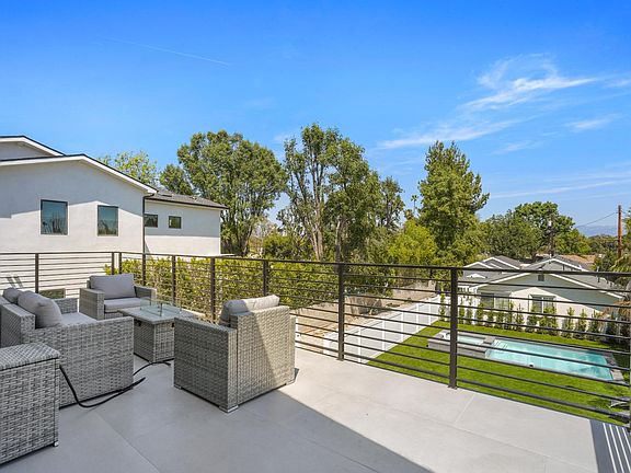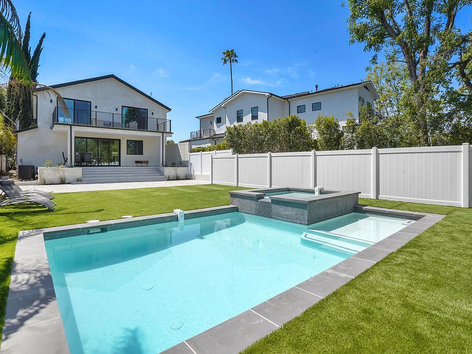 Streamlined modernism unites with today's indoor/outdoor lifestyle in this spectacular, newly built and FULLY FURNISHED home! This short term rental property is conveniently located in the highly coveted neighborhood of Encino, a short drive from the freeway system and a short walk from the famous Ventura Blvd. Elegant finish work throughout showcases this large open layout home in spectacular fashion. This picturesque home has a curb appeal that immediately grabs your attention and entices you to see more. A grand flagstone patio encompasses the front of the home as you step up to the patio and inside. Substantial comfort and style throughout showcase a keen eye for design with spaces that include a formal sitting room as you enter the home, an elegant dining area off the fully equipped kitchen and a wonderfully inviting living room with plush sectional seating focused on a large flat screen TV. The chef's kitchen includes new top-of-the-line appliances and is fully equipped for all your cooking needs. This sleek white kitchen is anchored by a massive waterfall-counter island and it also flows to the immaculate backyard, giving you the opportunity to take your pre or post dinner drinks outdoors. This backyard oasis includes a large patio with seating, plus an alfresco dining and BBQ area. There's a large synthetic grass area between the patio and the beautiful pool with spa, perfect for relaxing and entertaining. The short term furnished rental includes five modern bedrooms. Two bedrooms are located downstairs, including one with a private ensuite bathroom, perfect for those who have difficulty climbing stairs or prefer not to. Upstairs you'll find three additional bedrooms including the primary bedroom. This suite is not just a place to rest your head; it's a sanctuary of style, comfort, and durability. It includes a dedicated sofa seating area, large walk-in wardrobe, a stunning ensuite bathroom with large soaking tub and a private balcony with seating area overlooking the serene backyard. This property is just one of many furnished monthly rentals we have to offer. All properties are move in ready, completely furnished and offered for short term rental periods of 1 - 12 months. We have properties for all your furnished housing needs - whether you're looking for temporary housing while buying/selling your home, renovating or dealing with repairs of your own home, searching for corporate housing, or just need a furnished place to stay while enjoying everything Los Angeles has to offer! Contact us to make this fully furnished house yours. FULLY FURNISHED property available for short term to long term rentals (1-12 months) - not for sale. We pay commissions to real estate agents who bring tenants. Utilities can be added to monthly rent at an additional cost. Please note the monthly rate varies and is dependent on time of year and length of stay.