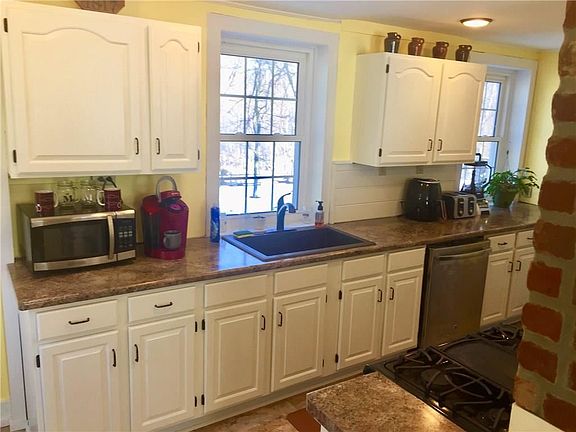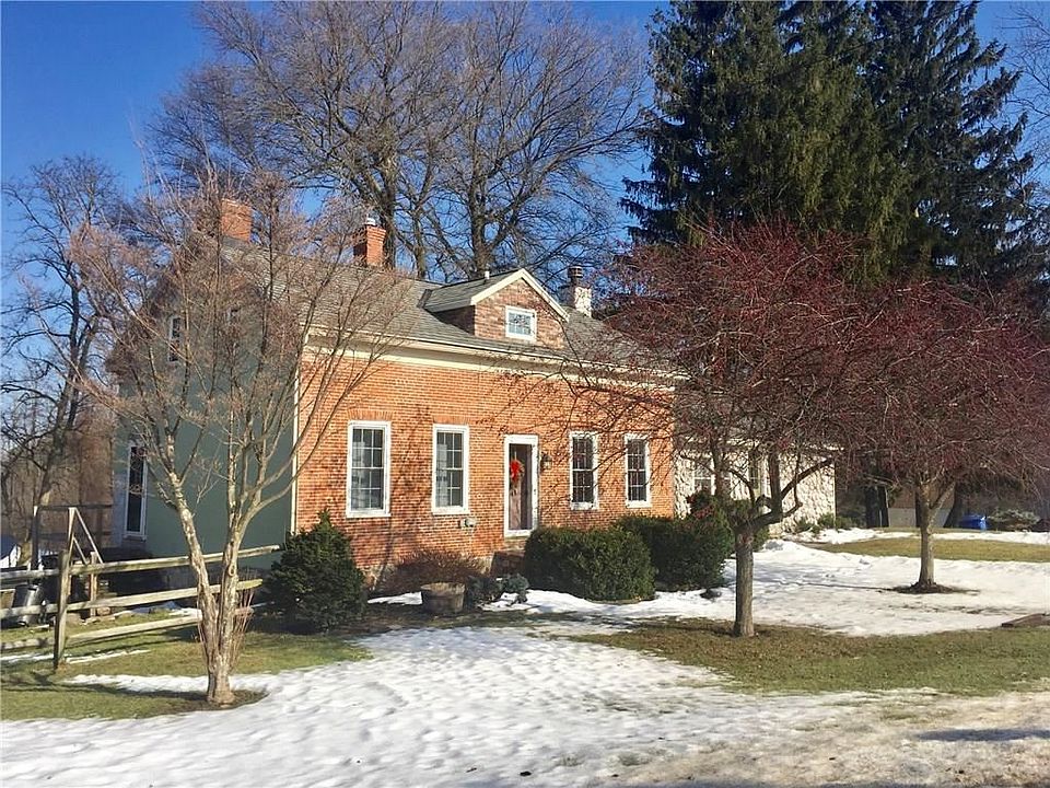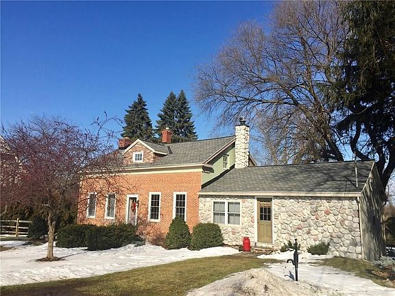 Come see this wonderful Historic brick and cobblestone home! 4 bedrooms, (one on the FIRST FLOOR!) The downstairs bath/laundry has a new, rustic barn door opening, newer resilient flooring and a BEAUTIFUL view of the scenic yard! The living room and office are separated by a double sided fireplace, framed in original beams (made of barnwood and cobblestone!) and open up to a large deck overlooking a park like yard! The upstairs Master is HUGE! with a fireplace as well, for a great aesthetic look or add a gas log! The kitchen has been opened up and a breakfast bar has been added, it also has not one pantry BUT TWO! Original plank coupled with resilient flooring, updated appliances, countertops and cupboards..newer roof, public sewer and natural gas make this one a REAL GEM!