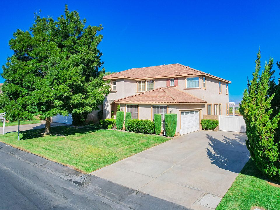 PAID OFF DETACHED SOLAR! This beautiful 5 bedroom, 4 bathroom house, featuring paid solar panels, is in the upscale gated community of Renaissance Estates. The design focuses on comfort and style, with a formal dining room and living room right at the entrance. It has travertine floors and soft carpets throughout, with granite countertops in the kitchen, creating a classy atmosphere. On the ground floor, there's a flexible bedroom and office space, along with a full bathroom, making it great for guests or working from home. A large family room next to the kitchen serves as a cozy gathering spot, and a wet bar adds a nice touch for entertaining. There's also a handy laundry room for convenience. Upstairs, you'll find a spacious loft area that leads to a big game room, perfect for relaxing or having fun. The master suite, designed for privacy, includes a retreat area, two large walk-in closets, double sinks, a separate shower, and a luxurious jetted tub. There are two more bedrooms upstairs, one with its own private bathroom for extra ease. Outside, the house has two garages one on each side of the home , allowing parking for up to four cars. In the backyard, enjoy views of the Antelope Valley, along with a built-in pool, spa, and a covered area extending from the family room. This home offers privacy, space, and modern features in a desirable location, making it an ideal choice for anyone looking for a peaceful and elegant lifestyle