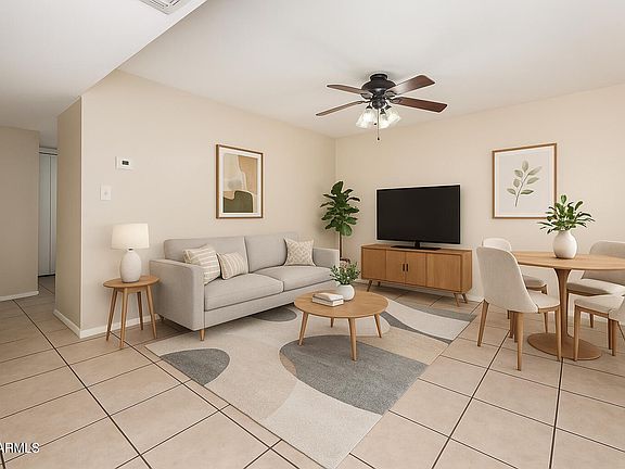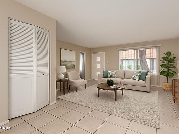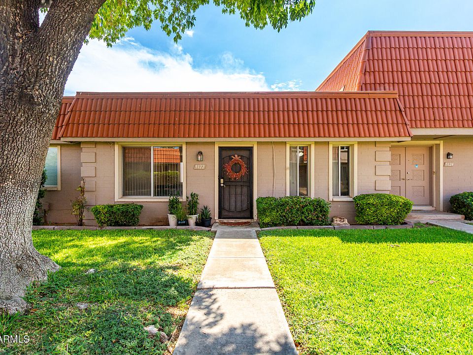 Rare 3 bed, 2 bath townhome in Chateau de Vie! Spacious living & dining with tile floors and neutral palette. Kitchen features ample cabinetry, tile counters, stainless appliances & modern lighting. Split primary suite with wood-look flooring, walk-in closet & ensuite bath. Enjoy N/S exposure, private patio, 2 covered parking spaces + storage. Community is beautifully maintained with mature landscaping, sparkling pool & walking paths. Steps to Chaparral Park, minutes to Old Town, 101, shops & dining!
