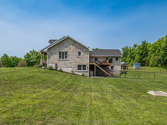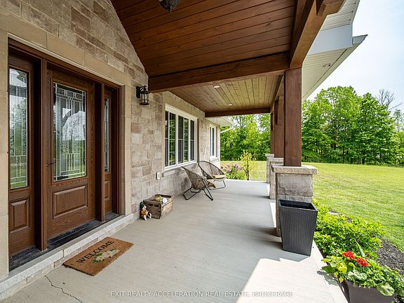 Situated on over 16 acres of serene countryside, this exquisite stone bungalow, built in 2022, offers a blend of modern luxury and rustic charm. Designed to capture the essence of country living while providing every comfort, the home boasts eight spacious bedrooms and five beautifully appointed bathrooms. The main level of the home is open-concept and bathed in natural light. The master suite is a true retreat, complete with a walk-in closet and a five-piece en-suite bathroom, ensuring a private oasis to unwind after a long day. Four of the five bedrooms are conveniently located on the main floor, offering ample space for family and guests, while the remaining bedroom is located in the lower level. Two of the bathrooms on the main level further enhance convenience, making this an ideal home for families of any size. Above the garage, a loft area offers additional room for a variety of uses, from an art studio to a quiet reading nook. The lower level is just as impressive, featuring a large cold room perfect for food storage, while the rest of the basement is equipped with in-floor radiant heating, ensuring comfort throughout the seasons. The expansive recreation room, complete with large glass sliding doors, opens directly onto the patio and fenced backyard, creating an ideal space for entertaining or simply enjoying the natural surroundings. The property is also home to over 100 Sugar Maple trees, offering a unique opportunity to tap for syrup. The land itself is perfect for exploring, gardening, or just enjoying the peace and privacy of rural living. The home also features a whole-house generator, providing peace of mind during inclement weather, and an attached garage equipped with an electric vehicle charging plug, ensuring your car is always ready to go. This remarkable property offers an exceptional lifestyle, blending the best of modern design with the tranquil beauty of the countryside, making it the perfect place to call home.