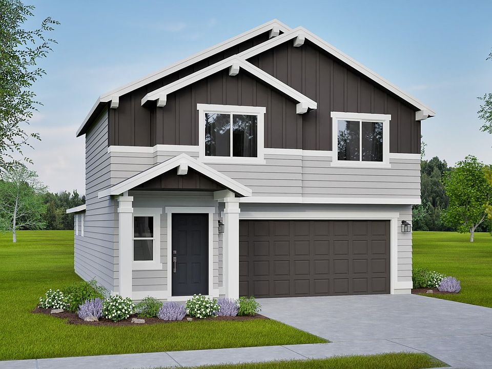 The 1395 square foot Darrington is a well-appointed two story home that lives larger than most mid-sized plans. The entry leads to the open kitchen and living room area, with plenty of light and space for entertaining. The kitchen boasts ample counter space and cupboard storage and organization. Upstairs, the main bedroom has a oversize closet and bathroom, and two other sizable bedrooms offer closets and share a second full bathroom.
