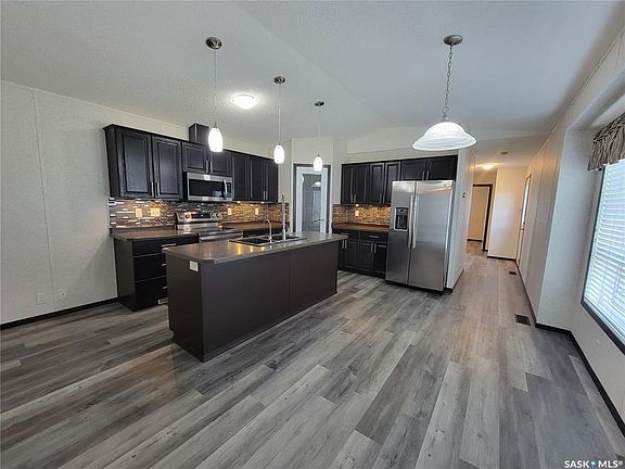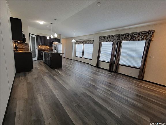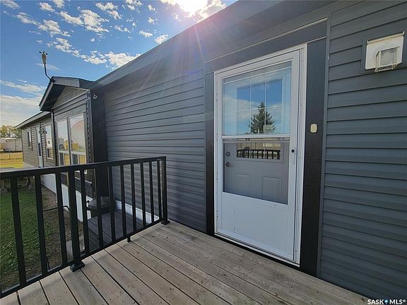 Welcome to 5123 Mirror Drive, Macklin, SK This 1,216 sq. ft. 2015 SRI Shelter-built home sits on an owned lot and offers a bright, functional layout. The main entry from the deck opens into a foyer leading to the open-concept kitchen, dining, and living room with vaulted ceilings, ample cabinetry, generous counter space, and stainless steel appliances. The primary suite includes a walk-in closet and 5-piece ensuite with deep soaker tub. A separate laundry room with secondary entry adds convenience. Two additional bedrooms and a 4-piece bath are located on the opposite end of the home. Inclusions: fridge, stove, dishwasher, microwave range hood.