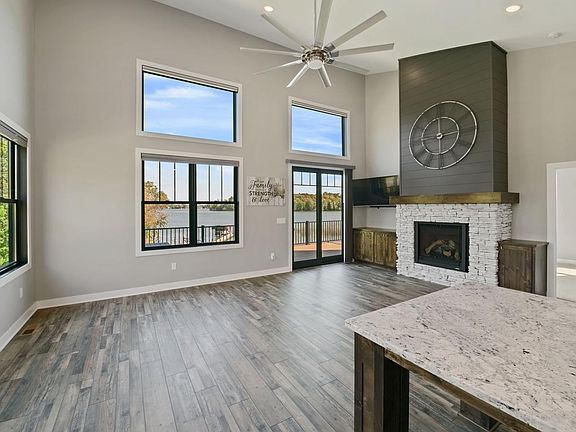 Lower patioSpacious deckGourmet kitchen with islandExpansive lake viewsCustom cabinetryWalkout lower levelLevel lot