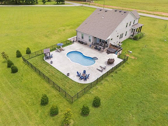 Welcome to a home that provides a blend of tranquility & luxury. This 2-story brick home set on over 3 acres invites you to breathe deeply the moment you arrive. Step through the grand iron lined front door into a bright foyer with high ceilings that lift your gaze. Each space is composed with intention, leading to the heart of the home an unparalleled open concept center. It is the perfect space for everything from warm family gatherings to an entertainer's dream with laughter and shared toasts! Start the morning with an espresso from the coffee bar adjacent to the kitchen. The kitchen features a double oven, gas cooktop, stainless steel appliances with included refrigerator, a spacious island with a ceramic farmhouse sink. The primary main floor suite features a large walk-in dressing room style closet, double vanities, and an oversized tiled shower. The utility area which consists of the laundry, featuring a stackable washer and dryer, and a family foyer leading to the garages. Behind sliding barn doors is a serene study/home office with a coffered ceiling. An additional bedroom and full bath complete the main level living area. Upstairs offers a continuation of warmth and fun for family and friends. A large, but cozy media room is ready for gaming, music, movies, reading or other hobbies. Additionally, another vast recreation area has room enough for features such as a 9-foot pool table, ping pong table, pinball/arcade machine, or any number of other pursuits. Two more bedrooms and a full bath complete the second level living area. Outside, a symphony of serenity awaits: a covered porch overlooks a spa-like pool glistening under Tennessee skies, a hot tub with privacy fencing beckons and a firepit casts flickering shadows as stars rise above. Exterior features also include a covered grilling area with electrical power for potential outdoor kitchen. The carriage garage provides storage for a boat, camper, etc. Country living w/ city conveniences minutes away.