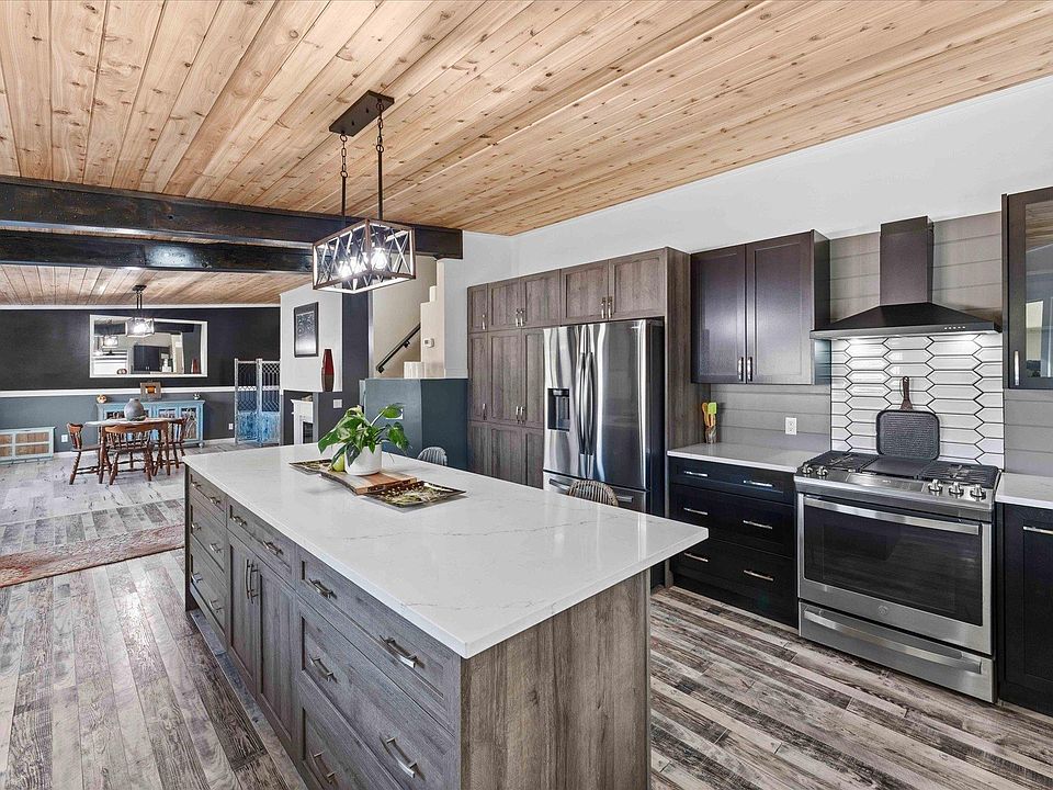 Brand new custom kitchenGas stovePull out microwave drawerSleek quartz countertopsStunning ensuiteVinyl windowsHuge cement patio
