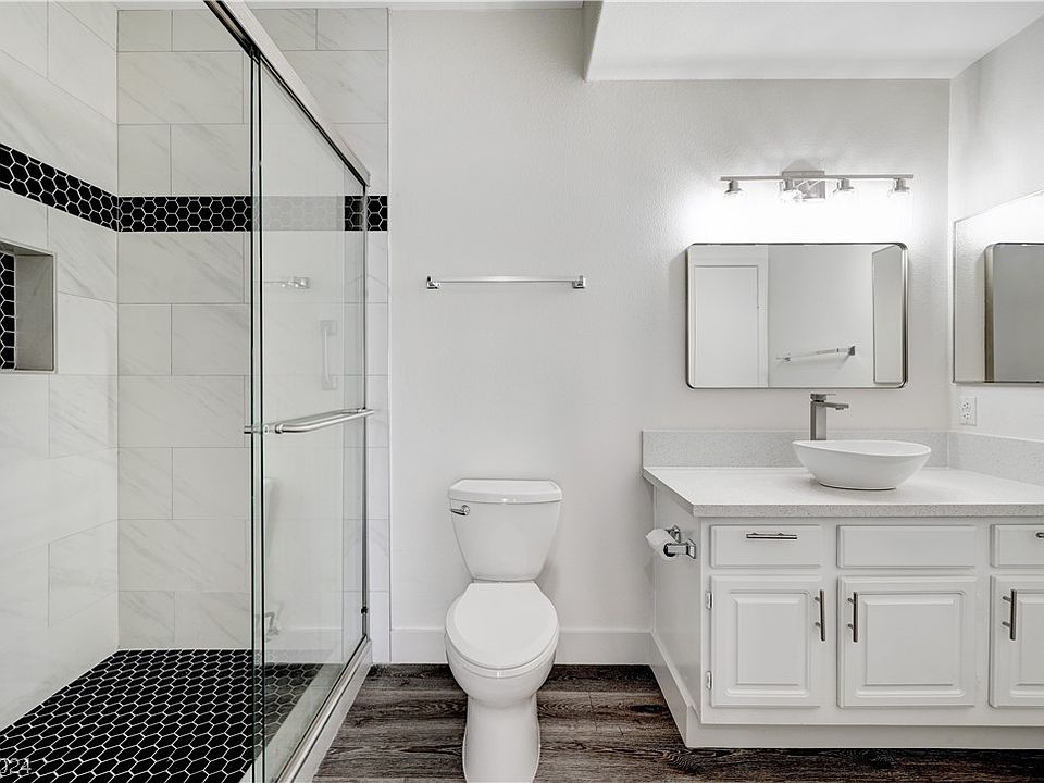 ** Welcome Home!! THIS IS A MUST SEE!! Remodeled and Ready to Simply MOVE IN!! Beautiful and spacious 1279 sf condo with 2 Bedrooms, 2 Bathrooms and a attached and finished 2 car garage. Beautiful open kitchen with stainless steel appliances, granite countertops, a pantry and beautiful LVP flooring throughout. Beautiful New quartz counters in both bathrooms with with bowl sinks and new fixtures. Unit has a sliding glass door in the primary bedroom that leads out to your patio. Recently installed upgraded Anderson windows throughout. AC unit is only 2 years old. Water heater is only 1 year old. This won't last long! Located in a gated community with a community pool and spa, exercise room and tons of amenities. Just minutes from the Las Vegas Strip, McCarran Airport, Raiders Stadium and more. Come see it today!