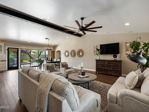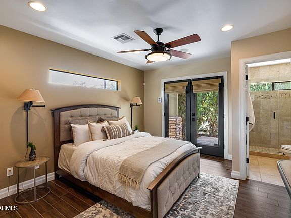Stunning 4 bed 3 bath Arcadia home that was completely rebuilt in 2011 with high end custom finishes. This house will not disappoint from the moment you walk thru the front door you will be greeted by an expansive & open floorplan w/ beautiful wood look tile flooring. The gourmet kitchen w/gas cook top, custom cabinetry, and large island open to the family room making it perfect for entertaining/gathering. A 4 panel sliding pocket door opens the house to the very private & low maintenance resort style backyard w/ heated pool and numerous water features. This home has two primary en-suite bedrooms (split), one w/a private entrance. Spacious 2 car side entry garage w/epoxy flooring & a large front porch to add to the elegant atmosphere & outdoor living AZ & Arcadia are known for.