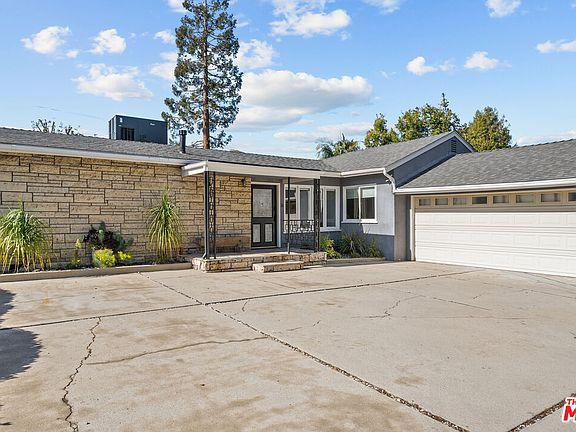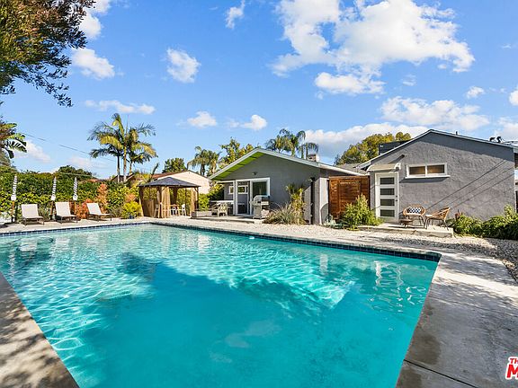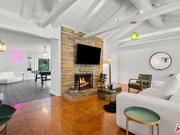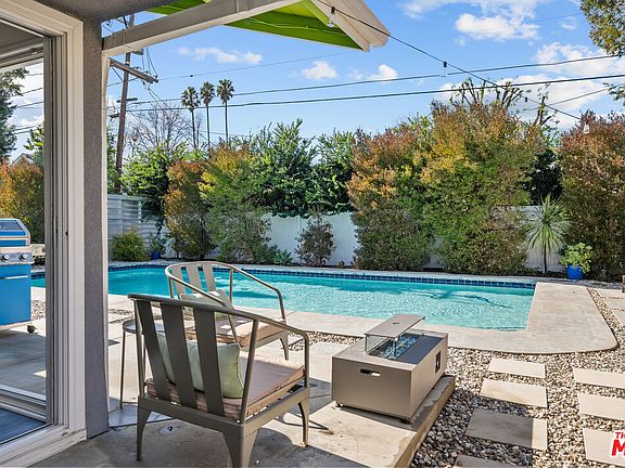 In the heart of Encino, this modern retreat showcases a seamless blend of classic mid-century warmth and fresh contemporary style, perfectly crafted for effortless California living. Step through the entry and into a light-filled living room, where vaulted beamed ceilings and a striking stone fireplace create a sense of warmth and quiet sophistication. Natural light floods the space, accentuating clean architectural lines and an open, airy flow. The layout transitions seamlessly into a spacious family room wrapped in glass, with sliding doors that open directly to the backyard blurring the line between indoor comfort and outdoor living. The kitchen stands as a vibrant focal point, featuring colorful quartz countertops, custom cabinetry, and state-of-the-art stainless steel appliances designed to elevate both everyday living and entertaining.The private primary suite offers a calm and inviting escape, complete with a generous walk-in closet and a beautifully remodeled bath with a frameless glass shower and modern finishes. Two additional bedrooms offer flexibility for guests, a home office, or a creative studio.Step outside to a resort-style backyard designed for true California living with a heated pool, spa, multiple patios for lounging or dining, and mature privacy landscaping. Whether hosting vibrant gatherings or enjoying a quiet morning by the water, the setting delivers an unmatched sense of ease and lifestyle. Additional highlights include a fully equipped gym, in-unit laundry, central air conditioning, built-ins throughout, and ample parking with both a garage and driveway. Set in one of Encino's most desirable neighborhoods, moments from Ventura Boulevard's premier dining, shopping, and amenities, this home embodies refined design, effortless functionality and elevated California living.
