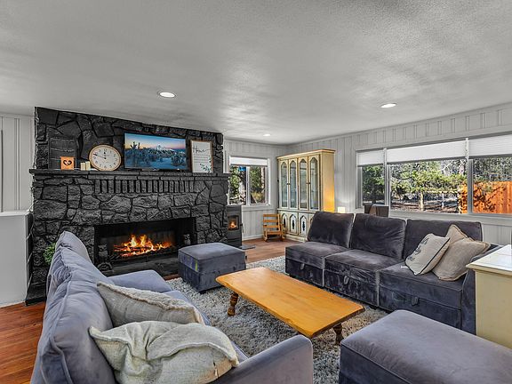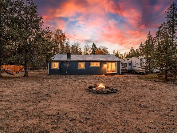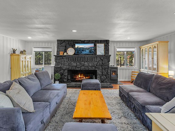 Set on a private one-acre lot, this beautifully renovated single-level home offers the perfect mix of comfort, privacy, & space for all your toys/critters. Open living area is filled w/an abundance of natural light, massive stone-surround wood-burning FP, addtn'l pellet stove, oversized vinyl picture windows, & hardwood floors throughout the main living area. Updated kitchen boasts abundant cabinetry, plenty of counter space, appliances included & an adjacent large dining or flex area perfect for gatherings. Primary bedroom ftrs sliding doors out to the back deck, while the secondary bedroom is well-sized & inviting. Lg bathroom ftrs a step-in tiled shower, soaking tub & dual vanities. Spacious laundry room w/washer & dryer! Outside, enjoy the peaceful, fire wise setting, expansive yard complete w/fire pit & endless possibilities this property provides! 50 amp RV hookup & amenities located on site. Fenced on three sides & borders BLM! Adjacent 1 acre lot + portable ADU also available.