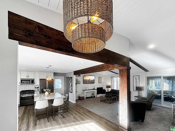 Welcome home to 513 Apollo Rd. This beautifully updated ranch home in Hinton, Iowa, offers four bedrooms and three bathrooms with modern upgrades throughout. The remodeled kitchen, completed in 2017, features granite countertops, a spacious kitchen island with storage, soft-close cabinets, and a large window that allows for abundant natural light. The kitchen opens seamlessly to the living room, which showcases striking wood beams and sliding doors that lead to a three-season porch. The main bathroom was updated in 2021 with an elegant Onyx shower and countertop. Recent updates in 2024 include new carpet, trim, and fresh paint throughout the main level. The master bedroom offers spacious double closets and an updated en-suite bathroom, completed in 2023. The finished basement provides a generous family room designed for relaxation and entertainment, featuring a newly added electric fireplace with built-in shelves in 2025. A projector in the family room enhances the space for an optimal game-day experience. Egress windows were installed in both the basement family room and bedroom in 2022. Exterior updates include permanent holiday lighting for effortless seasonal decor and new shingles and gutters installed in 2017. A concrete pad was added to the backyard in 2023, providing additional outdoor space. This home is updated, move-in ready, and offers a blend of modern finishes and functional living spaces!