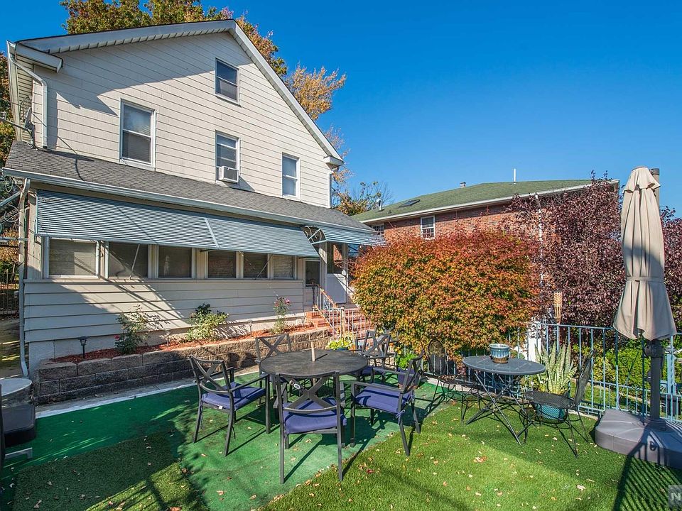 Renovated 2 Family Home. 4 bedrooms, 3 bonus rooms and 3 full baths, 2 car garage. Move In Ready. So much Space. Separate Utilities, 2 Large Eat-In Kitchens and lots of natural light. Hard wood floors throughout. 1st Fl has Eat-In Kitchen, granite countertops, solid wood cabinets, dishwasher, microwave, gas range and refrigerator, Living Room, Study Room, 2BRs/1BA with access to beautiful backyard, deck and a Finished Basement with 3 BonusRooms/1BA and Laundry. 2nd Floor: Living Room, Eat-In Kitchen, solid wood cabinets, 2 Bedrooms and 1 Bath. Use of Large Front Patio. Each unit has 1 car garage and 1 parking space. With possible Town Variance the Huge backyard (44x187 lot) could be separate lot suitable to build additional home, with separate driveway. Great Investment opportunity.