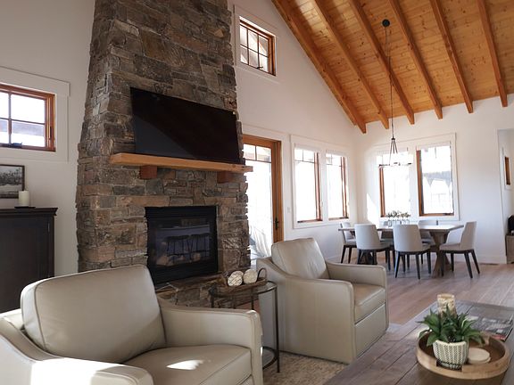 The house features 2 bedrooms and 1.75 bathrooms. The master includes a king-size bed with a private full bathroom. A second queen bedroom is adjacent to a bathroom with a tiled shower and washer/dryer. Additional sleeping accommodations, including one twin rollaway bed and one twin Murphy bed, allow 6 people to sleep comfortably. The home also boasts a large screened porch for indoor/outdoor dining and a spacious veranda with outdoor fireplace and ideal southern exposure providing sunlight throughout the day. Beyond the veranda, a generous grassy area surrounds this charming getaway, perfect for an outdoor evening barbecue and games on the lawn.