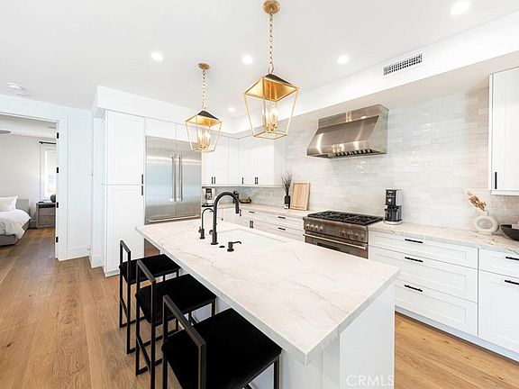 Step through the charming Dutch door and into an open-concept floor plan that defines California indoor/outdoor living. The gourmet kitchen is a true showpiece, featuring custom cabinetry, subway tile backsplash, an oversized island, and top-of-the-line Thermidor appliances. Wide-plank wood flooring and natural stone details create a warm yet refined coastal-chic atmosphere throughout. The primary suite is tucked just off the main living area, offering a serene retreat with dual sinks, a freestanding soaking tub, and an enclosed rain shower, your very own spa-like sanctuary.