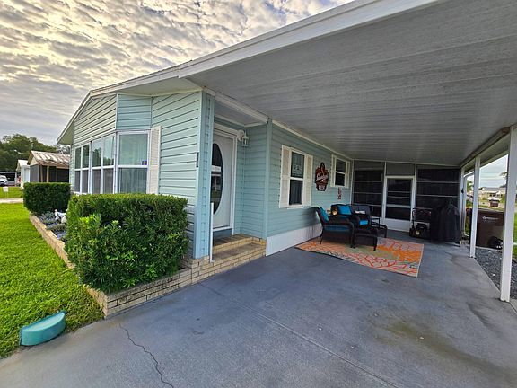 Welcome to your dream home in the highly sought-after Orange Acres Ranch 55+ community! This updated 2 bed, 2 bath home sits on a desirable corner lot and features stunning flooring throughout, walk-in closets in both bedrooms, and parking for up to 3 vehicles in the spacious driveway and carport. Enjoy a bright, open-concept kitchen with light cabinets, granite countertops, stainless steel appliances, a pantry, and cathedral ceilings for that airy, modern feel. Relax in your cozy sunroom, perfect for enjoying the peaceful surroundings of this scenic ranch-style community. The ensuite primary bath is a true retreat, featuring a jacuzzi soaking tub, tiled stand-up shower, and plenty of space to unwind.The home has ceiling fans throughout along with central air. The laundry room is a nice added feature with plenty of cabinet space. The shed is an added bonus for additional storage. Additional features include: Shingle roof; Gutters; and this home is turn key ready to move your things in without having to update. Community Amenities: Onsite management, Clubhouse, Library, Heated pool & jacuzzi, Pickleball & shuffleboard courts. Scenic ranch views all around. The LOT RENT is $677. You must be approved by management by filling out an application before your offer can be accepted via a contract agreeement. You don't want to miss out on owning this beauty. Call or text to schedule your showing. NOTE: THERE IS A WALK THROUGH VIDEO OF THIS HOME ON YOUTUBE by searching the address or by CLICKING THE VIRTUAL TOUR LINK