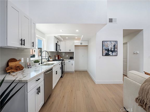 Discover this beautifully updated 2-bedroom, 2-bathroom condo, perfectly situated just 900 ft from beach access! This bright and airy home features an open floorplan with vaulted ceilings in the living area, a brand-new kitchen complete with quartz countertops, custom cabinets, subway tile backsplash, and stainless-steel appliances. Enjoy modern upgrades throughout, including fresh paint, new windows, recessed lighting, and sleek laminate flooring. Each bedroom opens to a private balcony, perfect for relaxing and taking in the soothing sea breeze. The stylish bathrooms feature quartz countertops, tile floors, and elegant black fixtures, with two fully tiled showers. The well-maintained complex recently received a fresh coat of exterior paint. Parking is hassle-free with both a garage and an assigned driveway spot. Situated in a lively beach community, this gem is mere moments from the Channel Islands Harbor, beach park, local restaurants, shops, and a bustling farmers market. Whether you're searching for a cozy coastal home or a weekend retreat, this property combines comfort, style, and the ultimate beachside charm. Don't miss out on this opportunity to make this your home!