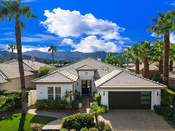 Experience the Pinnacle of Luxury Living at Mountain View Country Club. This extraordinary custom-designed residence that exemplifies refined desert living. Perfectly positioned on an elevated premier lot, the home boasts sweeping, unobstructed vistas of the Santa Rosa Mountains, expansive double fairways, and a tranquil lakefront setting--a view as rare as it is breathtaking. From the moment you step inside, the home welcomes you with a sense of timeless elegance. A dramatic feature wall of architectural stone, custom paneling, and ambient lighting sets the tone for the artistry and attention to detail found throughout. Soaring ceilings, walls of glass, and 24x48 Italian porcelain tile create contemporary grandeur, while curated designer finishes elevate every space. The open-concept great room is anchored by a statement fireplace wall with floating backlit panels and bespoke cabinetry. The formal dining area glows under a brass chandelier, perfect for both intimate dinners and grand gatherings. The custom gourmet kitchen is a chef's dream, featuring a 10-foot Quartzite island, Sub-Zero and Wolf appliances, and a custom wet bar with floating metal-and-glass shelving seamlessly blending function with artistry. The Primary Suite is a serene retreat, offering a Jacuzzi tub, expanded marble-accented shower, and Quartz countertops. Two additional guest suites include en-suite baths with floating vanities, custom closets, and private outdoor access from one suite. A versatile den easily serves as a 4th bedroom, complemented by a stylish 4th bath with marble accents and a custom vanity. Walls of retractable glass open to a resort-style backyard oasis with unobstructed mountain views. Entertain effortlessly around the sparkling pool and spa, built-in BBQ, patio heaters, and drop-down shades--an outdoor sanctuary designed for year-round enjoyment. Mountain View Country Club offers world-class amenities including an Arnold Palmer Signature 18-hole golf course, elegant Clubhouse Dining, a state-of-the-art Fitness Center with Spa services, Tennis and Pickleball courts, Bocce ball, and a Lap Pool. This home is a rare opportunity to own a residence where luxury, comfort, and natural beauty converge seamlessly--a desert retreat that feels like your own private Four Seasons escape.